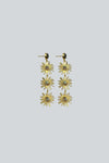 Aretes compuestos por tres piedras circulares y un abanico en forma circular. Base de latón bañada en oro de 18k con 1 micra, y piedras naturales trabajadas artesanalmente.