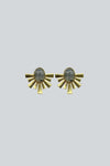 Aretes pequeños compuestos por una piedra ovalada rodeada por un abanico de tiras doradas. Base de latón con baño de oro de alta calidad y piedras naturales trabajadas artesanalmente.
