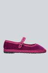 Ballerina con ribetes y cierre de hebilla. Exterior del zapato 100% terciopelo de algodón, con interior de tela 100% algodón y suela hecha de caucho reciclado.