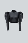 Blusa corta de cuello alto, con mangas largas abullonadas, confeccionada en tela semi-traslúcida con forro que aporta un toque arquitectónico y contemporáneo a la prenda.