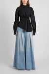 Blusa de manga larga con detalles de tableado al frente y cierre mediante botones en la espalda.
