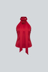Blusa halter con lazo anudable en el cuello, diseñada para un look femenino y sofisticado. Presenta una fina flor de satin en el cuello, botones forrados en espalda y estolas colgantes que aportan un acabado elegante y versátil.
