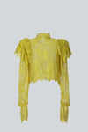 Blusa de manga larga confeccionada en un exquisito encaje semi-traslúcido color amarillo. Cuenta con detalles de volados en los hombros y puños de las mangas.