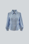 Camisa de manga larga con cuello, corte estilo top que estiliza la figura y plisado en los puños de las mangas. Cierre mediante ojales con botones.