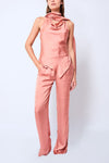 Blusa sin mangas confeccionada en una suave y ligera tela satinada con estolas en el cuello que pueden anudarse o colgarse al gusto para mayor versatilidad.