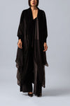 Conjunto compuesto por blusa de tirantes, pantalón a la cintura y sobrecapa estilo kimono con mangas. Confeccionado en una cómoda lycra aterciopelada, cuenta con detalles de tul en la sobrecapa que le otorgan volumen y movimiento.