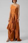 Conjunto de falda y top, perfecto para quienes buscan un estilo distintivo. La falda larga incorpora aberturas artísticas y capas de tela que crean una silueta fluida y dinámica. El top, de diseño asimétrico con tirantes elegantes, añade un toque de modernidad.