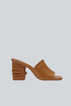 Sandalia estilo mule en piel con punta abierta y tacón corrugado.