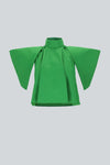 Top corto de cuello alto, confeccionado en una tela de caída elegante, con piezas independientes que crean mangas abiertas sobre los hombros, aportando movimiento y un efecto sofisticado.