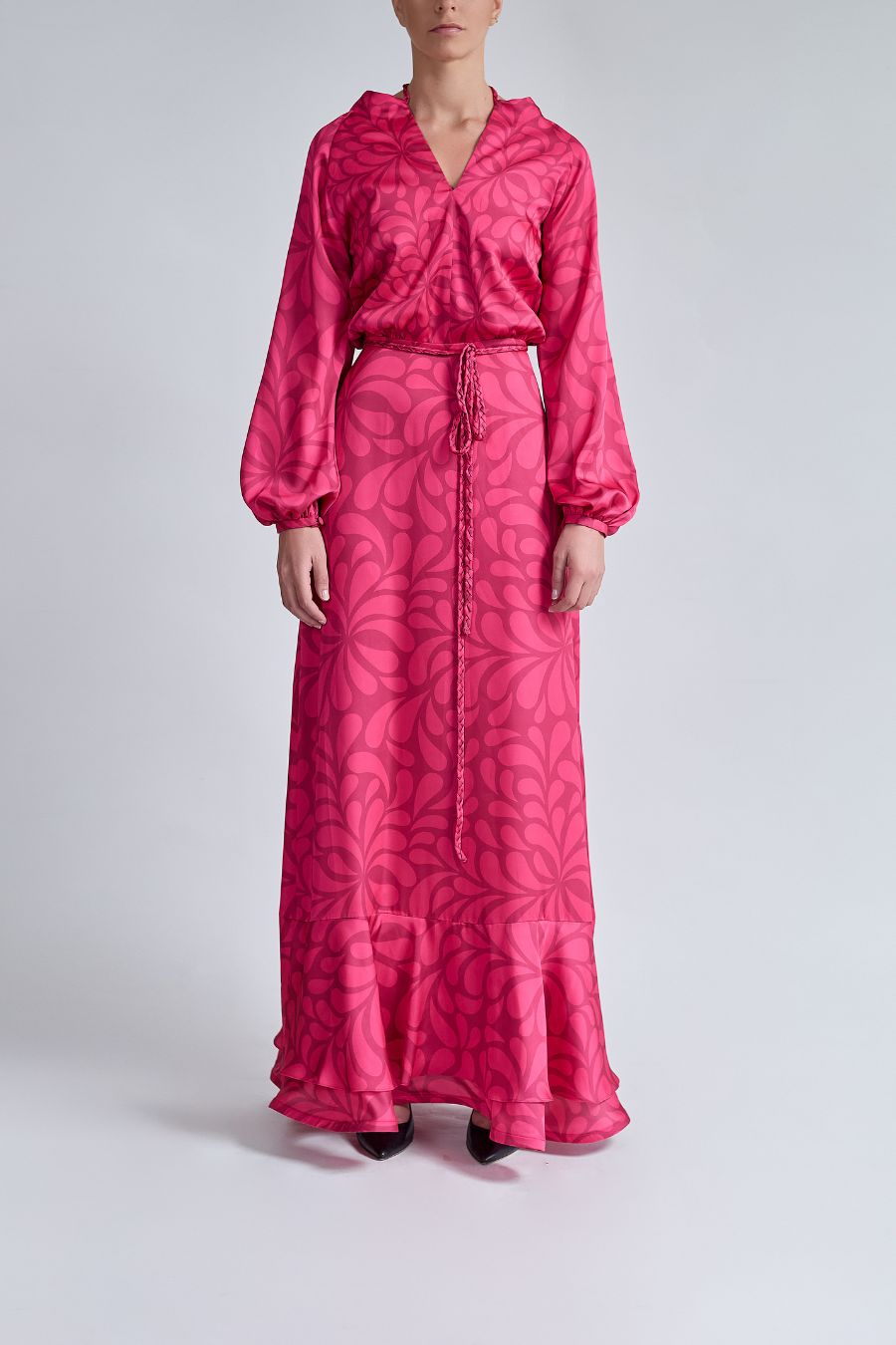 Vestido largo de manga larga, con escote en V y falda con vuelo. Confeccionado en tela estampada satinada ligera, cuenta con trenzas de tela anudables en escote y cintura.