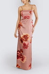 Vestido largo de tirantes delgados y escote abierto en la espalda confeccionado en un ligero y suave satín con estampado de autor. Cuenta con detalle de lazo anudable, tirantes colgantes con flores de tela en la espalda y cierre mediante cremallera invisible en la parte posterior de la falda.