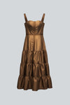 Vestido midi con escote recto de ligera forma corazón y tirantes anchos. Presenta cuerpo estructurado tipo corset con costuras que realzan la silueta y falda fruncida en capas, logrando un diseño femenino y sofisticado.